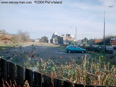 | Remaining clear of the carriageway our route will cut across the bottom end of Grant Gardens to a stop located beside West Derby Road on this waste ground.